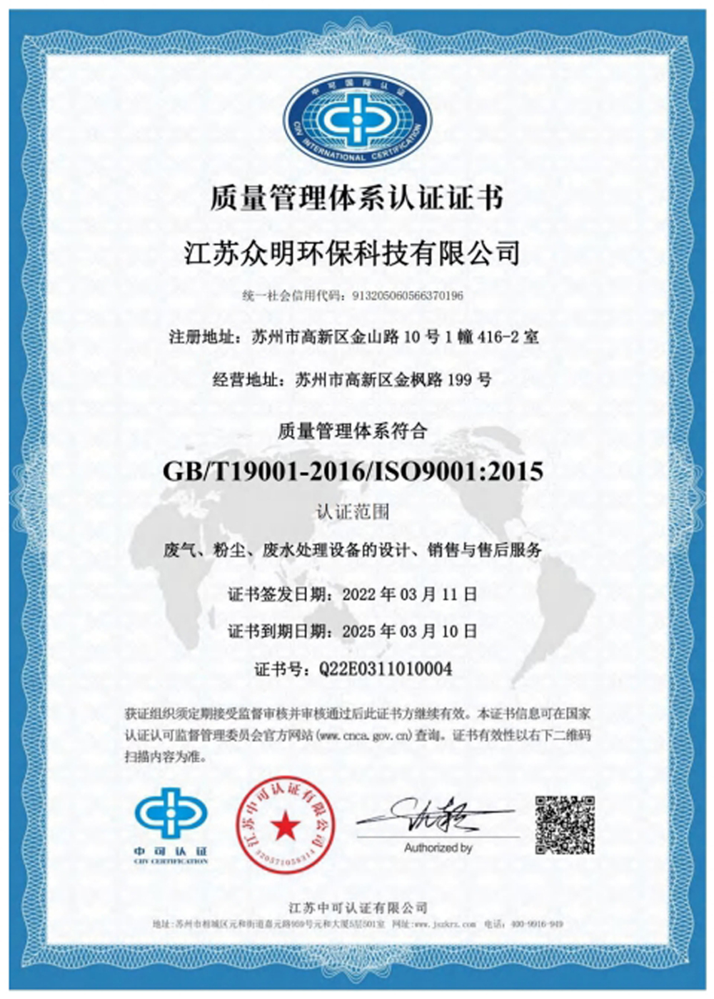 質量管理體系認證證書